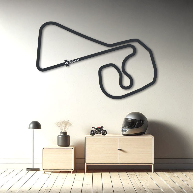 Réplica del circuito de motociclismo Sachsenring de Alemania realizado en madera DM de 5 mm. recortada con láser y pintada en color negro.